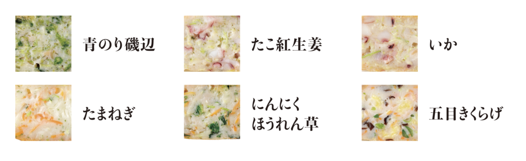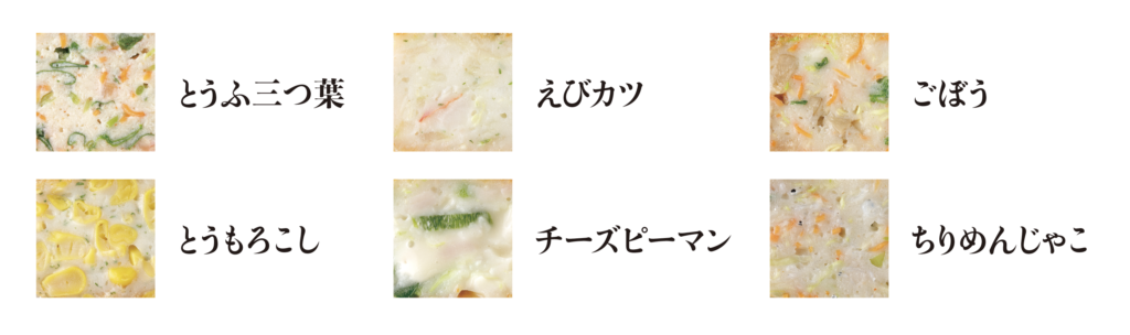 とうふ三つ葉/えびカツ/ごぼう/とうもろこし/チーズピーマン/ちりめんじゃこ/青のり磯辺/たこ紅生姜/いか/たまねぎ/にんにくほうれん草/五目きくらげ
