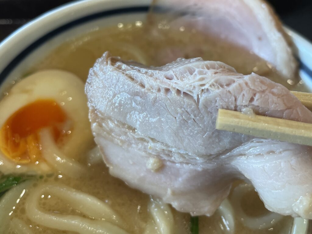 噛めば噛むほど肉の旨味があふれ出し、ほどよい脂がスープにコクをプラス。ジューシーでホロっとやわらかく、それでいてしっかりとした歯ごたえがあり、ひと切れでも大満足の食べ応えあるチャーシューです。