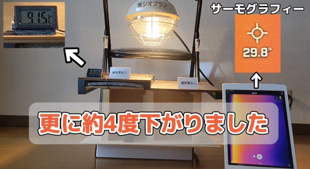 画像は通気層のない屋根とある屋根で室内の温度がどう変わるのか実験をしたものです。