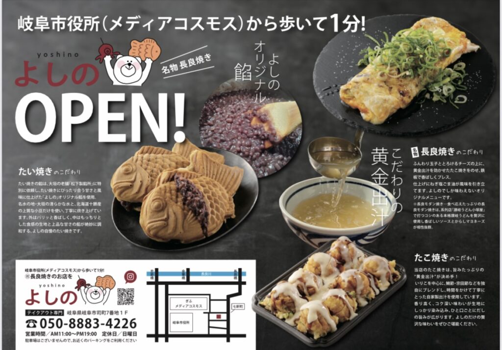 📍岐阜・メディアコスモスから徒歩わずか1分!“岐阜の新名物になるかも!?”と早くも話題の長良焼きが楽しめる注目の新店『よしの』が、ついに7/15(火)にオープン!
