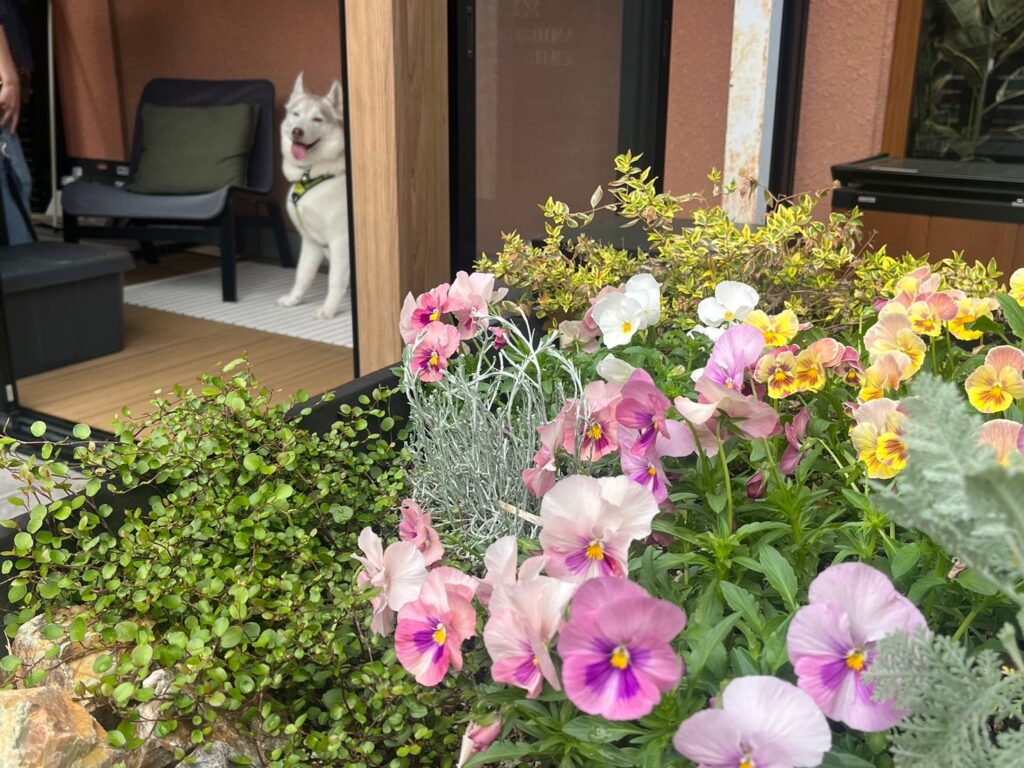 ①季節や天候を問わず、愛犬とくつろげる内と外の間のような空間。