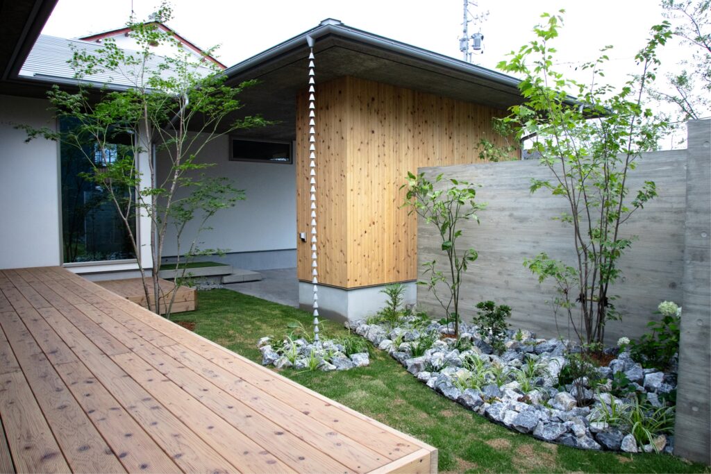 ①お家の木目がより活きる、木目のあるコンクリートの外構。有名な建築にも使われる工法をお家でも。