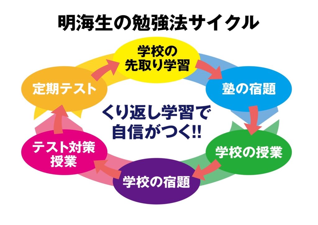 明海ゼミナールでは、学校の授業より少し先を進む先取り学習を実施。新しい内容を前もって理解しておくことで、学校の授業が復習になり、理解度が深まります。
