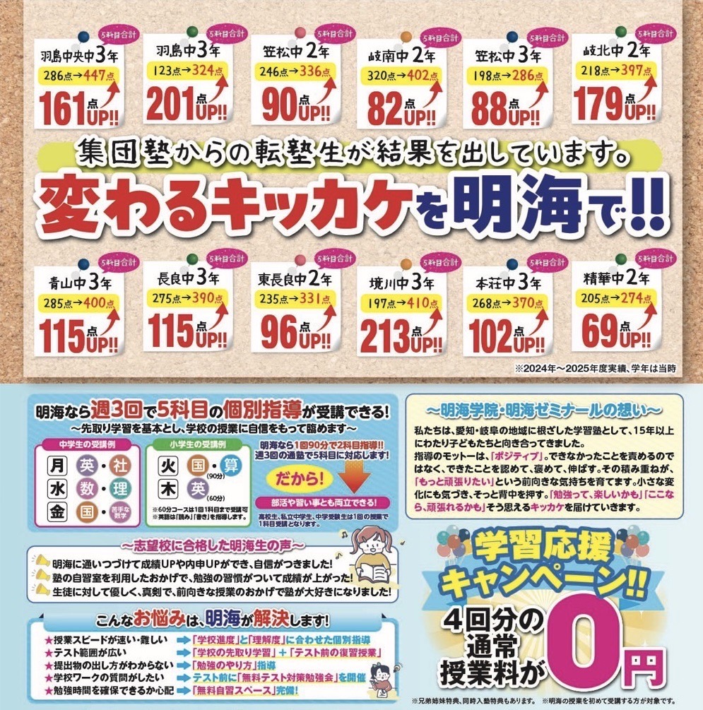 今回は、岐阜市内を中心に地域密着で実績を重ねている個別指導塾「明海ゼミナール」をご紹介。一人ひとりに寄り添う柔軟な学習スタイルと、5科目にしっかり対応する力強いサポート体制で、地域から信頼されている塾です。