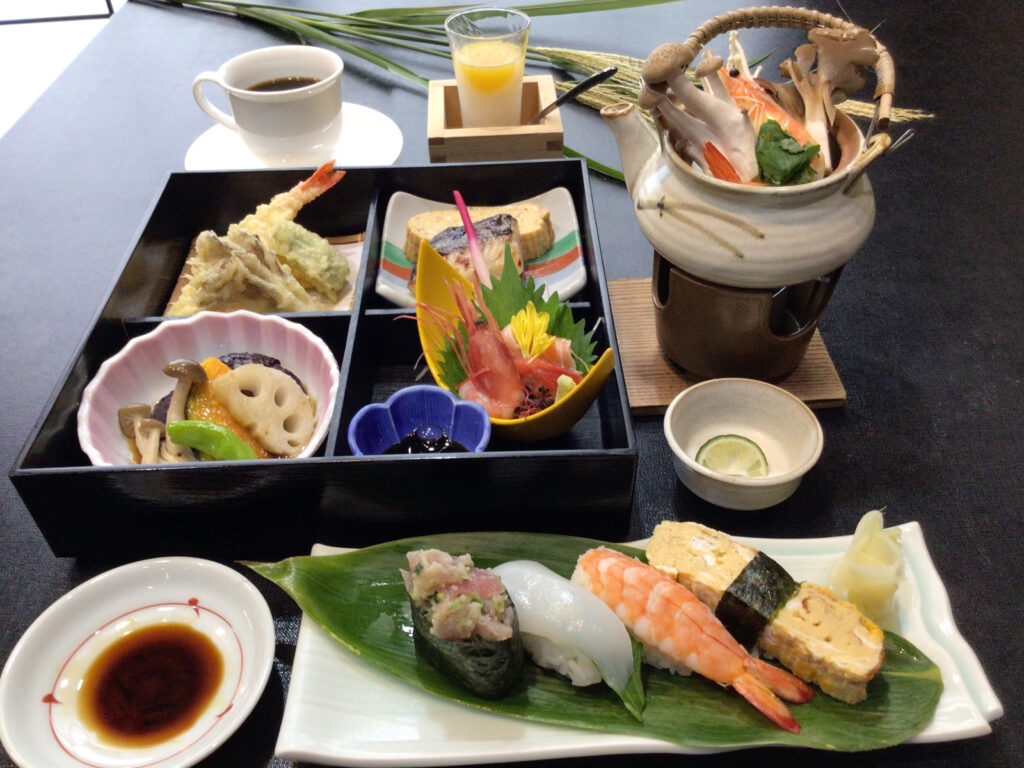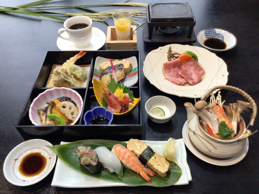 天ぷら/焼き物/旬の野菜の煮びたし/刺身/キノコの土瓶蒸し/和牛ステーキ/にぎり寿司/デザート/ドリンク