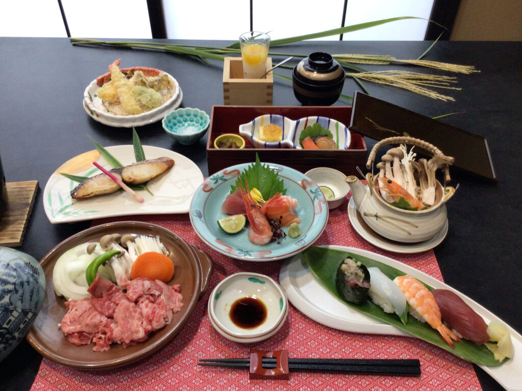 ・前菜・刺身・きのこの土瓶蒸し・焼物・揚物・肉料理・寿司・赤だし・デザート
