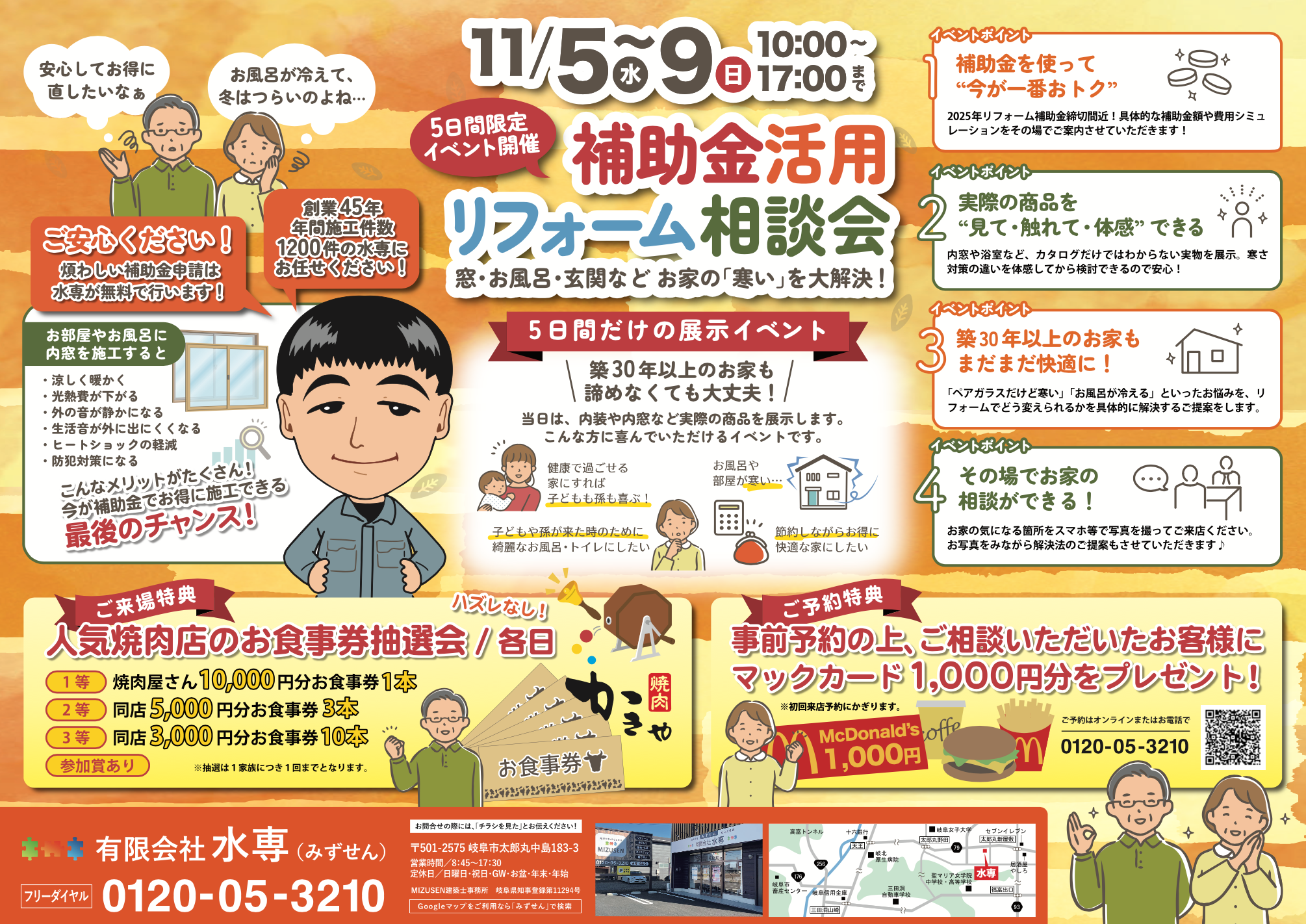 寒さが本格化する前に、お家の悩みを気軽に相談できるのが、水専の「5日間だけの展示イベント」です。内窓や高断熱浴槽などの体感展示を通して、実際の効果を確認しながらリフォームを検討できます。さらに、今年度で終了予定の補助金を活用した費用シミュレーションもその場で相談可能。