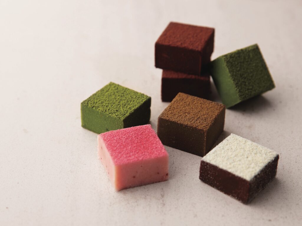 天空の古来茶を使用した香ばしい「深煎り焙じ」や、芳醇な香りが広がる「純米吟醸 房島屋」など、地元の恵みを贅沢に生かしたこだわりの生チョコレート。口に入れた瞬間、なめらかにほどけ、素材本来の香りと深い味わいがゆっくりと広がります。