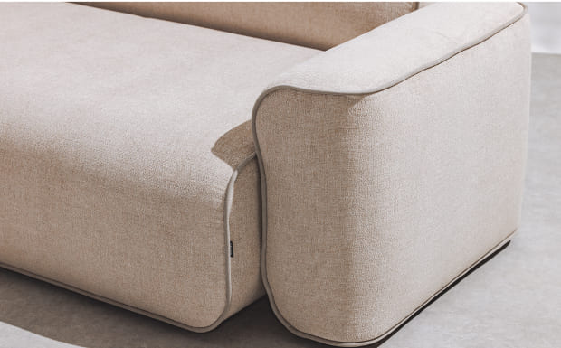 座面を広く取るためにアームを細く設計し、横になりやすい高さで快適性を追求した〈レオン〉。高密度ウレタンとフェザーを重ねたクッションが、やさしく身体を包み込みます。カバーは着脱可能で、座・背クッションは取り外し式。お手入れもしやすく、毎日のくつろぎに寄り添う一脚です。