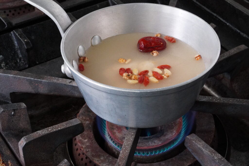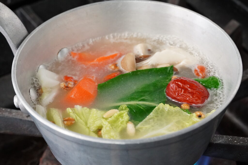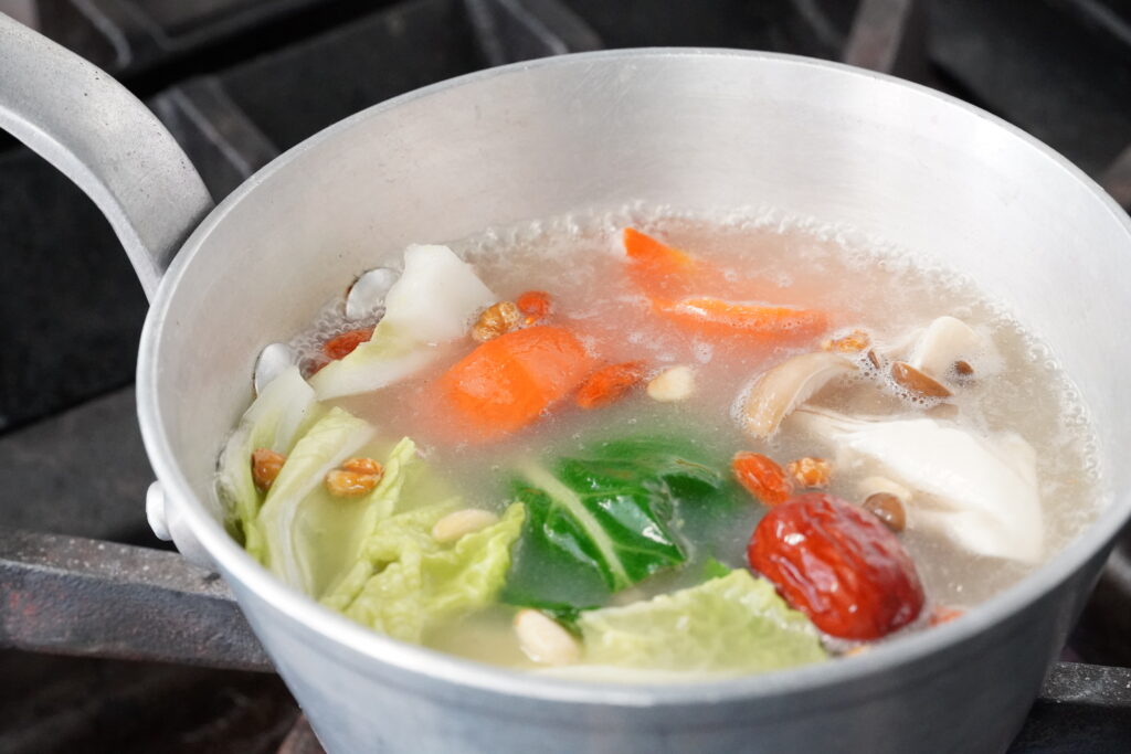 ① スープの袋と別添えの薬膳を鍋に入れ、中火で沸騰させる。