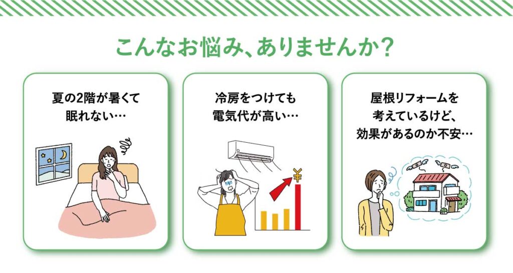 夏の屋根は、素材によっては80℃以上になるほど高温に。その熱が屋根裏へ伝わり、室内にこもることで冷房が効きにくく、電気代ばかり上がってしまいます。