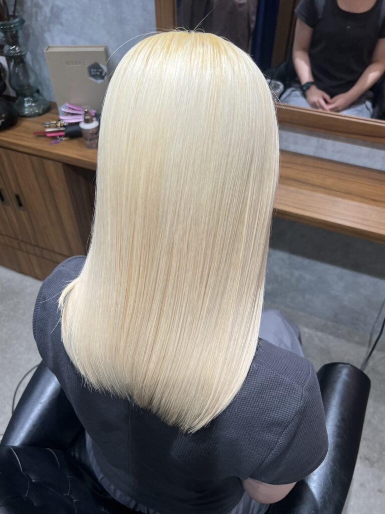 A. 正直に言うと、ブリーチ自体がまったくノーダメージということはありません。 ただ、髪の状態・これまでの履歴をしっかり見た上で、「ここまでなら大丈夫」というラインを見極めて施術しています。 無理に一度で明るくせず、必要最低限のパワーで行うことで、できる限りダメージを抑えながらハイトーンを楽しめるようにしています。