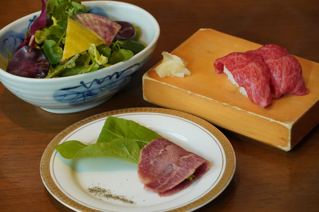 最高級の銘柄牛を使った炙り握り寿司は、口に入れた瞬間に豊かな風味と繊細な甘みが広がります。