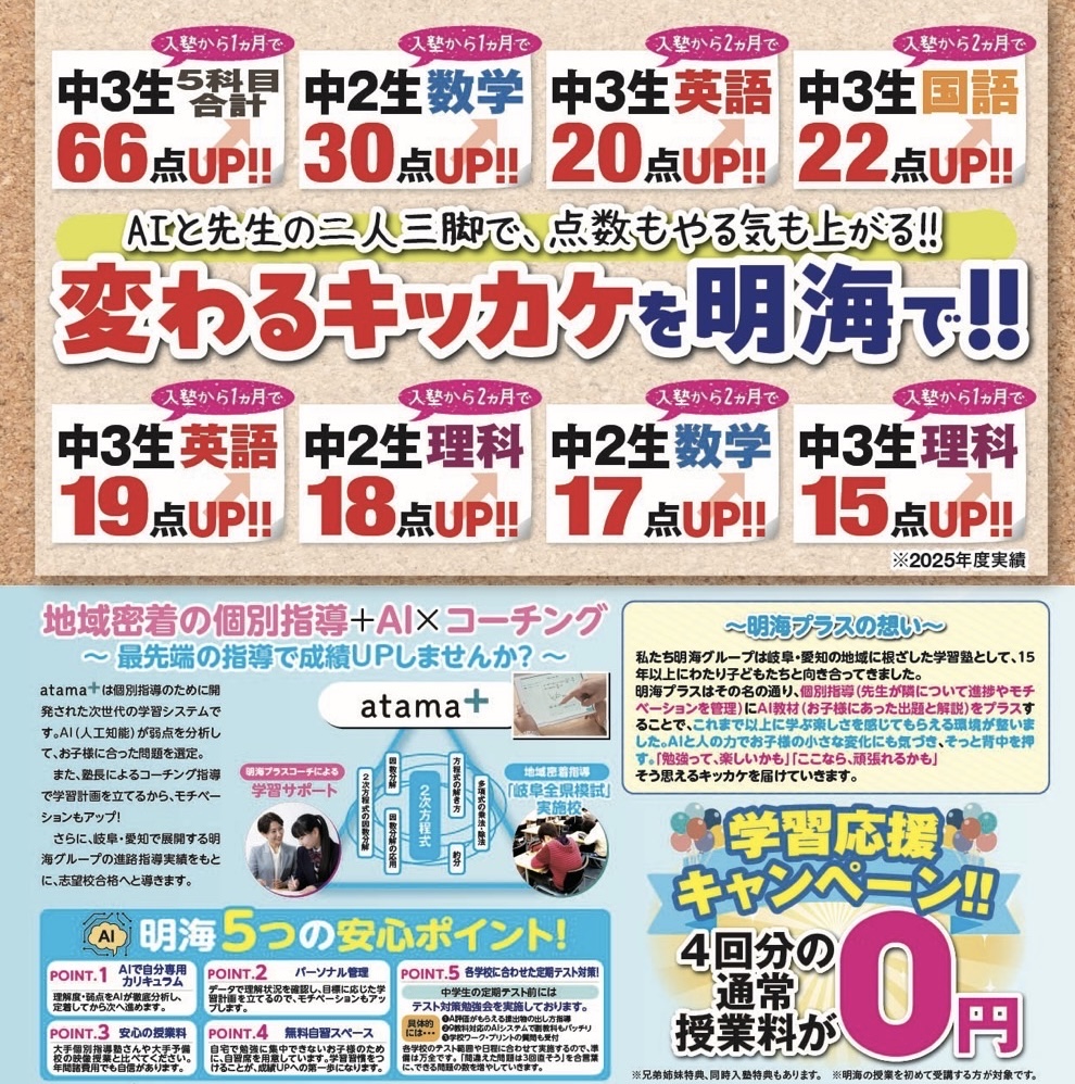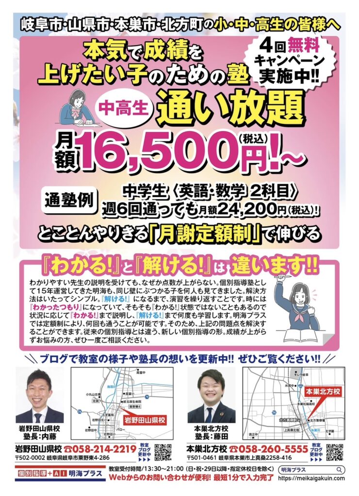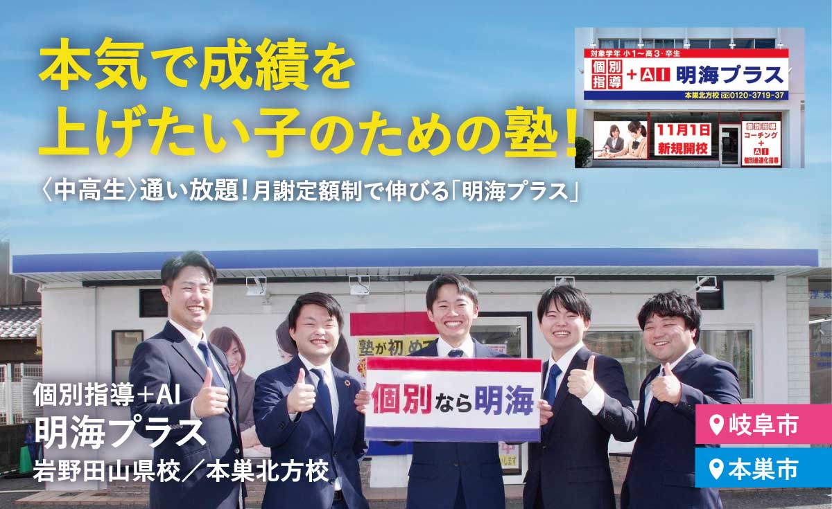 📍個別指導+AI 明海プラス 岩野田山県校【住所】岐阜県岐阜市粟野東4-286【電話】058-214-2219【受付時間 】13:30~21:00(日曜・祝日、毎月29日~31日を除く)【駐車場】有※岩野田山県校での個別説明会をご希望の方は上記番号までお問い合わせください。